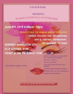 Caliz B Hair presents the Women in Pink Ball and Fundraiser on June 9th from 6pm to 10pm. Venue is the Holiday Inn in Richardson, Texas.